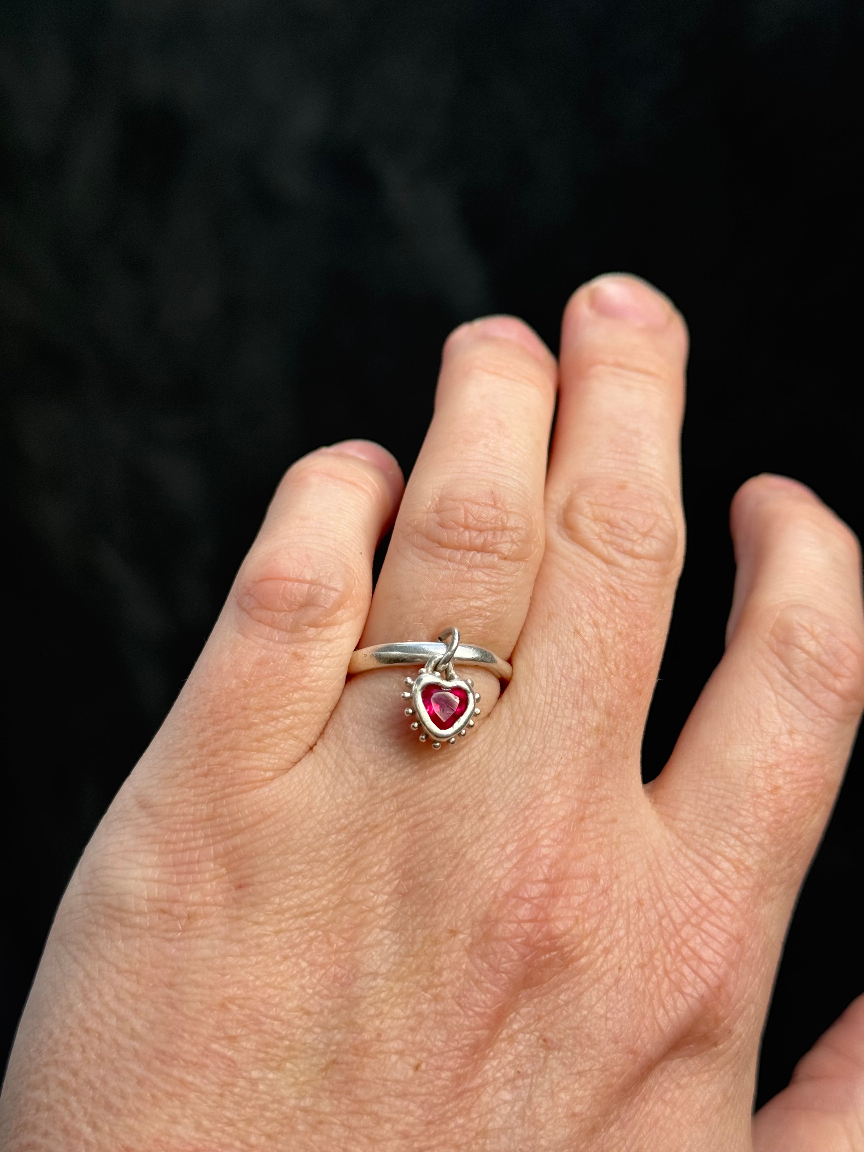 If charms are your thing, you're going to love the heart dangling ring. With careful details added too ensure it doesn't swivel around yet still has freedom to move, this is the perfect stacking ring (or wear it on its own). The ring and heart pendant have been hand carved in wax, and the piece will be sized and cast in silver with the heart added to finish it.